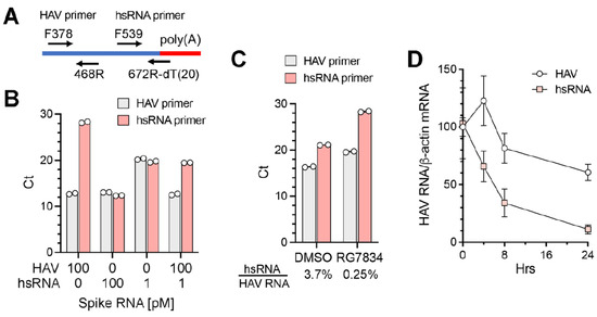 To better quantify the abundance of hsRNAs in infected cells under various conditions, we developed a qPCR assay specific for hsRNAs (Figure 5A). The reverse primer for hsRNAs comprised a 20 nt dT oligomer followed by 6 nts complementary to nt667–672 of the HAV genome (nt679–684 of the 18f virus). When tested with synthetic RNAs, the hsRNA primer set specifically amplified hsRNA with only minimal amplification of full-length positive-strand genomic RNA; in contrast, the HAV primer set amplified both RNAs equally (Figure 5B). A quantitative difference was evident when the synthetic hsRNA concentration was reduced from 100 pM to 1 pM in the reaction. Importantly, when the hsRNA and genomic RNA were mixed at a ratio of 1:100, which approximates the composition in infected cells, the hsRNA primer set accurately measured the abundance of hsRNA with minimal interference from the genomic RNA (Figure 5B). We used this assay to characterize RNA extracted from HAV-infected Huh-7.5 cells. The hsRNA/genomic RNA ratio measured by qPCR was 3.7% in infected cells (Figure 5C). RG7834 treatment reduced the genomic RNA abundance by ~8-fold while reducing the hsRNA abundance > 100-fold, resulting in a hsRNA/genomic RNA ratio of 0.25% (Figure 5C). This result is in line with the nanopore sequencing results shown in Figure 4C. Since TENT4 polyadenylation is associated with enhanced stability for both cellular and viral RNAs [8,31], we speculate that the greater reduction in hsRNA abundance following RG7834 treatment reflects enhanced decay due to reduced TENT4 polyadenylation. To explore this hypothesis, we assessed the decay of hsRNA after RG7834 treatment over a time course of 24 h. As shown in Figure 5D, the hsRNA degrades more rapidly (half-life ~ 6 h) than HAV genome RNA (half-life > 24 h) following the initiation of RG7834 treatment. These results are consistent with the notion that TENT4 polyadenylates and stabilizes hsRNAs.