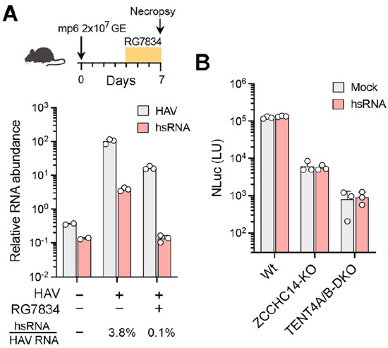 hsRNAs are present in vivo in infected mice but do not rescue viral replication in ZCCHC14-TENT4-depleted hepatoma cells. (A) (top) Outline of HAV infection in Ifnar1−/− mice inoculated intravenously with mouse-passaged mp6 virus and treated with RG7834 or DMSO vehicle only, administered by oral gavage at 10 µg/kg twice daily between days 4 and 7 post-infection. (bottom) qRT-PCR quantitation of genomic HAV RNA and hsRNA in infected mouse livers 7 days post-infection, with or without RG7834 treatment. RNA levels were normalized to β-actin mRNA. HAV RNA levels in infected mice without treatment were arbitrarily set to 100 (n = 3). (B) Wildtype Huh-7.5, ZCCHC14-KO, and TENT4A/B-DKO cells were transfected with synthetic hsRNA for 2 h and infected with the 18f-NLuc reporter virus. NLuc activities were measured at 72 h post-infection (n = 3).