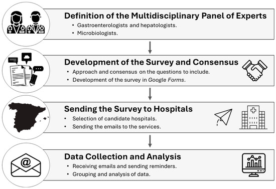 A descriptive cross-sectional study was designed to evaluate the status of a comprehensive diagnosis of viral hepatitis. A structured survey was developed to collect data from Spanish hospitals in the context of the diagnosis of viral hepatitis before the implementation and publication of the recommendation document [14]. A panel of experts made up of microbiologists, hepatologists, and digestives drafted and agreed on the list of questions included in the survey. The survey was designed via the Google Forms platform. The survey was sent to the person responsible for the diagnosis of viral hepatitis in the selected hospitals. The hospitals selected included public and private hospitals with more than 200 beds listed in the National Catalogue of Hospitals (NCHs) [17]. The invitation to participate in the survey, which included the link, was sent by email on 20 October 2022. Reminders were sent before the first deadline set for the receipt of results (1 December 2022). The final deadline for data receipt was 28 February 2023 (Figure 1).