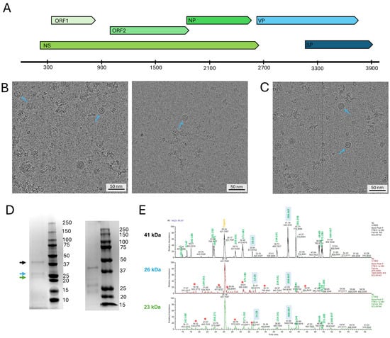 Analysis of the composition of the Syngnathus scovellis chapparvovirus (SsChPV) capsid protein. (A) Schematic diagram of the SsChPV genome; open reading frames (ORFs) of the non-structural (NS) expression cassette are marked by various shades of green, while ORFs located within the structural protein (VP) cassette are presented in shades of blue. Abbreviations: NP—nucleoprotein, SP—putative structural protein. The axis represents the genome position and is labeled in increments of nucleotides (nt). (B) Cryo-electron micrographs of particles expressed by the co-infection of SsChPV-VP-BAC and SsChPV-SP-BAC bacmids expressing the VP and SP proteins, respectively. (C) Cryo-electron micrograph of particles expressed by the SsChPV-VP-BAC only, encoding the VP protein exclusively. (D) SDS-PAGE analysis of the particles purified from the VP–SP suspension (left panel) and from the VP-only suspension (right panel). The ladders indicate the molecular weight of each fraction in kDa. The arrows show the protein bands excised and subjected to LC-MS/MS protein sequencing. (E) Results of the LC-MS/MS sequencing from panel (D). Peaks labeled by green numbers were identified as peptides of the VP ORF. The shaded background indicates peptides corresponding with the N- and C-termini of the ORF. Peaks marked by a red star are of host origin from the Sf9 moth cell line of Spodoptera frugiperda.