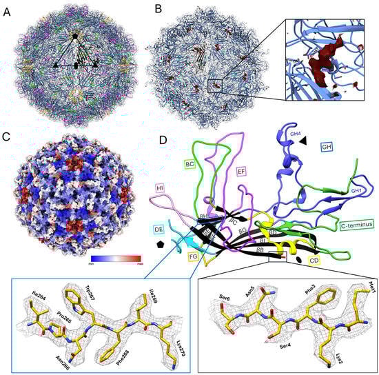 - Simpson, A.A.; Chipman, P.R.; Baker, T.S.; Tijssen, P.; Rossmann, M.G. The structure of an insect parvovirus (Galleria mellonella densovirus) at 3.7 A resolution. Structure 1998, 6, 1355–1367. [Google Scholar] [CrossRef]