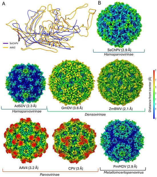 The Syngnathus scovelli chapparvovirus (SsChPV) capsid in a structural context with other parvoviruses. (A) Superimposed ribbon diagrams of the SsChPV subunit and adeno-associated virus 4 (AAV4) of PDB ID 2G8G, scoring the highest structural similarity scores as measured with the DALI structure comparison server. (B) Comparison of the SsChPV capsid surface to representatives of all major parvoviral lineages. The surface diagrams are radially colored from the capsid center on a uniform scale. The icosahedral particles are oriented by the I1 convention, with the twofold symmetry axis facing the viewer in the z-plane, while the threefold axes are in the x-plane, and the fivefold axes are in the y-plane. This orientation is identical to that of panel A in Figure 2. Abbreviations: AdSDV—Acheta domesticus segmented densovirus, AAV4—adeno-associated virus 4, CPV—canine parvovirus, GmDV—Galleria mellonella densovirus, PmMDV—Penaeus monodon metallodensovirus, ZmBWV—Zophobas morio black wasting virus.