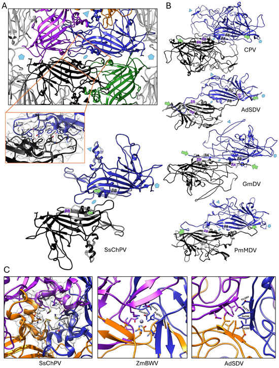 Multimer interactions at the Syngnathus scovelli chapparvovirus (SsChPV) twofold and threefold symmetry axes. (A) The SsChPV twofold axis in context with its neighboring subunits from the capsid interior. The blue and black ribbon diagrams indicate the dimer, while the magenta and gold diagrams represent the threefold subunit and the green diagram shows the fivefold neighboring subunit to the monomer highlighted in blue. Pentamers mark the fivefold symmetry axes, triangles the threefold symmetry axes, and the ellipsoid the twofold symmetry axes. The magnified panel shows the sidechains with corresponding electron density, which are responsible for keeping the dimer together. (B) Comparison of the SsChPV’s dimer architecture with all the twofold interface-forming strategies of parvoviruses thus far. The two subunits are represented by the black and blue ribbon diagrams, respectively. The first ordered N-terminal residue of each subunit is marked by the green arrows. The interacting β-strands are labeled accordingly. Canine parvovirus (CPV) represents the Parvovirinae subfamily, where βA–βB strand interactions occur within the same subunit. Acheta domesticus parvovirus (AdSDV) of the Hamaparvovirinae displays the domain-swapping conformation, which facilitates the interaction between the βA and βG of the two distinct subunits. Galleria mellonella densovirus (GmDV) of the Densovirinae displays the canonical domain-swapping conformation of βA–βB interactions. Penaeus monodon metallodensovirus (PmMDV) is of a divergent lineage without a subfamily affiliation and constructs its capsid interior of βB–βB interactions in a domain-swapping conformation. (C) Comparison of the pore at the SsChPV threefold symmetry axis with the β-annulus-like threefold pores of a densovirus, Zophobas morio black wasting virus (ZmBWV), and AdSDV, a hamaparvovirus. While the pores of SsChPV and ZmBWV are similarly sized at 13 Å and 12 Å, respectively, the ZmBWV β-annulus coordinates an ion. The 10 Å wide pore in AdSDV relies on hydrophobic interactions for stability. Each subunit comprising the trimer is represented by a different color.
