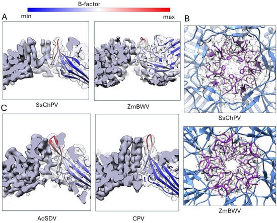 Comparison of the Syngnathus scovelli chapparvovirus (SsChPV) fivefold-related multimer interactions with those of other parvoviruses. (A) Cross-section view of the short, degraded channel at the SsChPV fivefold symmetry axis (left panel), with it facing outward from the fivefold pore. Only members of the Densovirinae subfamily, represented here by the Zophobas morio black wasting virus (ZmBWV), display a similarly reduced fivefold channel (right panel). The electron density map of a single subunit of the pentamer is shown as transparent, revealing the atomic model as a ribbon diagram, colored by its B-factor. Both density maps were filtered to a resolution of 3.5 Å to minimize noise. (B) The top–down view of the SsChPV fivefold symmetry axis shows the lack of ordering in the residue sidechains associated with the DE loop (purple), unlike the well-defined sidechain densities of corresponding residues lining the ZmBWV fivefold channel (bottom panel). (C) The typical, well-defined fivefold channels of the Hamaparvovirinae and the Parvovirinae, to compare with those seen in panel (A). The panel follows the color and representation scheme of panel (A). Abbreviations: AdSDV—Acheta domesticus parvovirus, CPV—canine parvovirus.