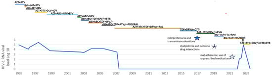 - Sterman, F.L.; Lalezari, J.P.; Kowalczyk, U.M.; Main, D.W.; Grant, E.M.; Caro, L.; Manning, C.M.; Burke, R.L. Bictegravir/emtricitabine/tenofovir alafenamide plus doravirine in highly treatment-experienced men with multidrug-resistant HIV. AIDS 2023, 37, 1057–1064. [Google Scholar] [CrossRef] [PubMed]