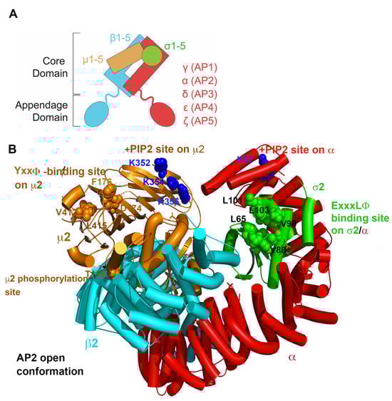- Canagarajah, B.J.; Ren, X.; Bonifacino, J.S.; Hurley, J.H. The Clathrin Adaptor Complexes as a Paradigm for Membrane-Associated Allostery. Protein Sci. 2013, 22, 517–529. [Google Scholar] [CrossRef] [PubMed]