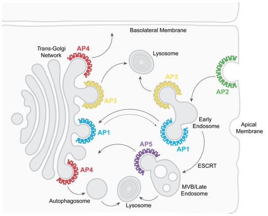 - Sanger, A.; Hirst, J.; Davies, A.K.; Robinson, M.S. Adaptor Protein Complexes and Disease at a Glance. J. Cell Sci. 2019, 132, jcs222992. [Google Scholar] [CrossRef] [PubMed]