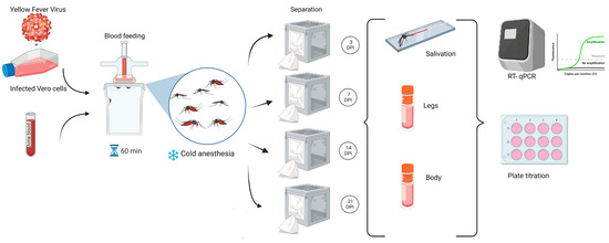 The viral stock (7.2 log10 PFU/mL) was prepared after four passages on Vero C76 cells and frozen at −86 °C until oral mosquito infections. The titer was obtained by plaque assays on 12-well plates of Vero cells and qRT-PCR to confirm YFV infection was performed.