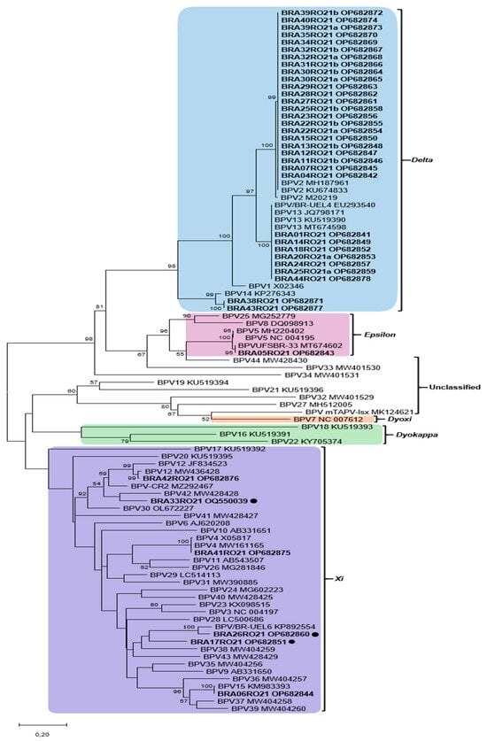 In relation to the strains that clustered with the Xipapillomavirus, BPV15 (BRA06RO21), BPV4 (BRA41RO21), and BPV12 (BRA42RO21) were identified. In addition, three strains showed phylogenetic distances greater than (BRA33RO21, BRA17RO21) or around 10% (BRA26RO21) when compared to the sequences deposited in the online database. For this reason, the BRA17RO21, BRA26RO21, and BRA33RO21 strains were classified in this study as PNT. The BRA17RO21 and BRA26RO21 sequences (78.80% similarity between them) showed a common ancestor with BPV38 and BPV43. The BRA17RO21 strain showed 77.08% similarity with BPV38, while the BRA26RO21 strain showed 91.98% and 79.08% with the strain KP892554 and BPV15, respectively. The BRA33RO21 sequence showed a common ancestor with BPV42 (83.23% identity) and with the MZ292467 strain (84.19%). All results presented here are summarized in Figure 1 and Supplementary Materials Figure S2.