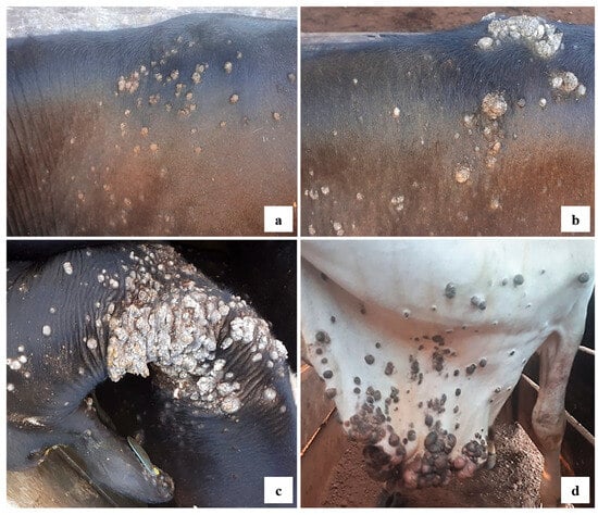 Morphology of cutaneous warts on cattle in the study. (a) Multiple flat papillomas on the back and thorax of animal BRA19RO21. (b,c) Exophytic masses with a cauliflower appearance on the neck and back of cattle BRA20RO21a and BRA39RO21b, respectively. (d) Pedunculated warts on dewlap and neck of animal BRA04RO21.
