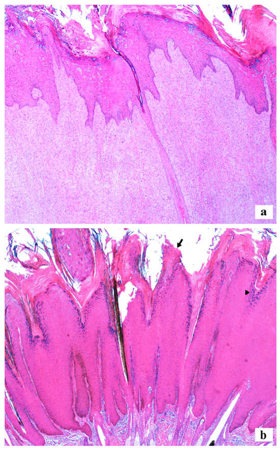 In both histological types, the epidermal proliferation was formed by hyperplasia of cells in the spinous stratum, covered by moderate to marked parakeratotic or orthokeratotic hyperkeratosis in the corneum stratum. Most cases showed an increase in intracytoplasmic keratohyalin granules (93.62%; 44/47) and the presence of an inflammatory infiltrate (46.81%; 22/47), characterized mainly by discrete to marked number of lymphocytes and plasma cells in the deep dermis or among the proliferated fibroblasts. There were occasional cases with koilocytes (27.66%; 13/47), intranuclear eosinophilic inclusions (14.89%; 7/47), and cytopathic viral effect (2.13%; 1/47).