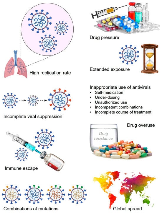High replication rate, multiple mutations, immune escape strategies, incomplete suppression, drug pressure, and prolonged exposure due to overuse, along with global spread, are the major causes behind the rapid emergence of drug resistance in SARS-CoV-2 [29]. The high replication rate of SARS-CoV-2 also allows a huge chance for the incorporation of mutations and errors in the genome. The accumulation of different mutations develops a high chance for the rapid emergence of antiviral drug resistance. Importantly, antiviral drugs generate a selective pressure that provides chances for rapid evolution of SARS-CoV-2 mutants [30]. Notably, selective SARS-CoV-2 mutants evolved under this selection pressure and survived well leading to antiviral drug resistance. Similarly, prolonged exposure to antiviral drugs allows better opportunities for SARS-CoV-2 mutants to overcome the antiviral drug-associated selective pressure in the form of continuous viral replication and evolution of drug resistance. On the other hand, incomplete viral suppression provides more opportunities for survival, evolution, and development of new resistance mechanisms against existing antivirals of SARS-CoV-2 [31]. Furthermore, infection with different mutants of SARS-CoV-2 at a single time point might exhibit a more complex situation for targeted antiviral drugs that also fail multiple drug combinations and even the evolution of new mutants of SARS-CoV-2 [32]. Additionally, injudicious use of antivirals including over- or under-dosing, self- and non-regulated medication, short-time or non-recommended courses, along with incompetent uses, potentially allows the development of antiviral drug resistance in SARS-CoV-2 [33]. Above all, the global spread and transmission of SARS-CoV-2 via different means significantly poses a great impact on the rapid evolution of drug resistance in SARS-CoV-2 that results in varied antiviral efficacies due to complex drug-resistant patterns. In summary, high replication rate, drug pressure, extended exposure to the antivirals, incomplete viral suppression, immune escape, overuse of antivirals, global spread, and injudicious use of antivirals such as self-medication, under-dosing, unauthorized use, and insufficient treatment periods are major factors behind the rapid emergence of drug resistance in SARS-CoV-2 (Figure 1).