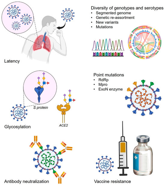 The spike protein of SARS-CoV-2 and its mammalian receptor ACE2 are both highly glycosylated. Notably, these glycans are essentially involved in and responsible for viral infectivity as well as in host immune dodging, thus playing an important role in the development of drug resistance [29]. Importantly, spike protein glycans alter their binding affinity towards ACE2 by modulating the conformation and stability that directly affects viral infectivity leading to resistance development. Similarly, glycans on the ACE2 such as N90 and N322 were demonstrated to play an essential role in spike protein binding. However, N90 glycosylation does interfere with binding and inhibit the viral docking on human cells while N322 glycosylation positively interacts with spike protein and stabilizes the viral–host interaction [34]. Additionally, mannosidase-I, a glycosylation inhibitor, has already been shown to restrict viral entry via modulating the glycosylation pattern of the SARS-CoV-2 spike protein [35]. Furthermore, glycosylation is also involved in and restricts immune recognition, vaccine efficiency, and dodging neutralizing antibodies [36]. Overall, glycans have been suggested to play an important role in drug-resistant development in SARS-CoV-2 and can be utilized as a potential tool in therapeutic development in the battle against the rapid emergence of drug-resistance development in SARS-CoV-2 (Figure 2).
