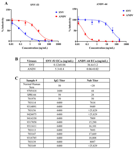 Assays were conducted using authentic SNV and ANDV to evaluate the neutralization titers of monoclonal antibodies SNV-53 and ANDV-44, as well as sera from SNV-infected patients. First, we tested the previously published antibodies (kindly provided by James Crowe, Vanderbilt University) [12] in a neutralization assay using authentic hantaviruses in our BSL-3 laboratory; immunofluorescence staining and microscopy were used to detect the virus. Serially diluted monoclonal antibodies were mixed with authentic SNV or ANDV and added to the cells in BSL-3. After 72 h, the infected monolayers were fixed with 10% formalin, the viral NP was detected with a polyclonal antibody against ANDV (which also recognizes SNV), and immunofluorescence microscopy was performed. The SNV-53 demonstrated strong neutralizing activity against SNV, with an EC50 value of 0.12 ± 0.04 ng/mL and limited cross-neutralization against ANDV (EC50 = 5.3 ± 0.4 ng/mL) (Figure 1A,B), indicating restricted cross-reactivity between these hantaviruses. Conversely, ANDV-44 potently neutralized ANDV (EC50 = 0.06 ± 0.02 ng/mL) while displaying a significantly lower neutralization of SNV (EC50 = 36.6 ± 3.2 ng/mL). These findings corroborate prior studies on the specificity of these monoclonal antibodies.