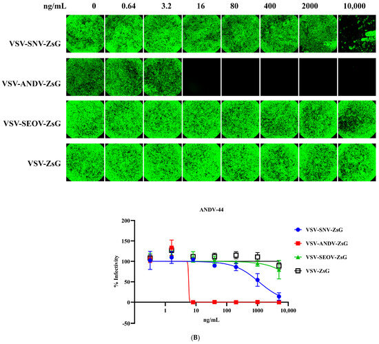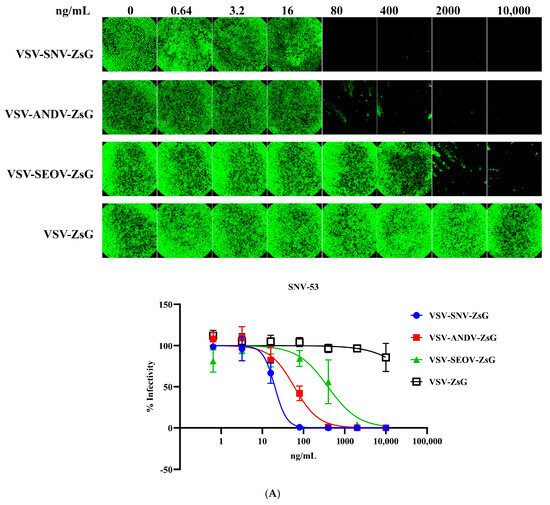 Neutralization of VSV-SNV-ZsG and VSV-ANDV-ZsG by monoclonal antibodies. Dose-dependent reduction in (A) VSV-SNV-ZsG and (B) VSV-ANDV-ZsG infectivity by SNV-53 and ANDV-44.