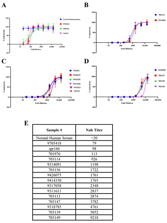 Neutralization potency of clinical samples against VSV-SNV-ZsG. Neutralization curves with sera grouped by potency from weakest (A–D) to strongest. (E) Nab titers of all clinical samples.