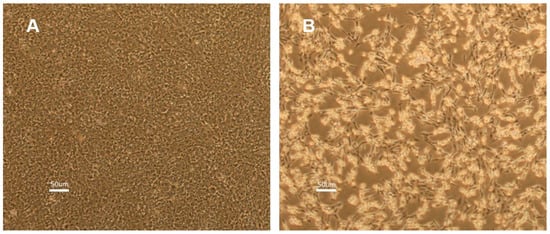 SAF-1 cells infected with ISKNV. (A). Uninfected SAF-1 cells (control) on day 2. (B) ISKNV-infected SAF-1 cells showing cytopathic effects on day 2 post-infection at 28 °C.