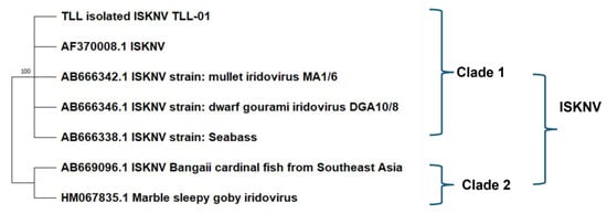 Phylogenetic tree for representative ISKNV genotype clade and the Asian seabass ISKNV isolate (TLL-01, GenBank accession number PV101205), calculated by the maximum likelihood method.