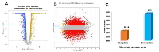 Visualization of DEGs between ISKNV-infected and healthy ASB spleen tissues. (A) MA plot of the DEGs, where each point represents a gene. The X-axis represents log2 (counts per million), while the Y-axis represents log2 (fold change). (B) Volcano plot showing DEGs between ISKNV-infected and healthy ASB spleens. The X-axis represents log2 (fold change), and the Y-axis represents -log10(FDR). The Y-axis corresponds to the -log10 of adjusted p-values for all read counts in each comparison. (C) Bar chart of upregulated and downregulated DEGs in ISKNV-infected and healthy ASB spleens.