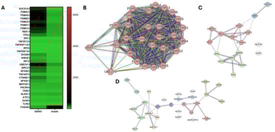 In our transcriptional analysis, 369 DEGs were identified as relevant to immunological processes, including innate and adaptive immunity, antigen processing and presentation, cytokine signaling, the Toll-like receptor (TLR) pathway, and the interferon (IFN) pathway. Among these, 136 genes were associated with cytokine responses, 131 with antigen processing and presentation, 153 with the adaptive immune system, and 206 with the innate immune system. A total of 31 genes were common to the adaptive immune system, innate immune system, antigen processing and presentation, and cytokine signaling pathways. The expression patterns of selected DEGs, measured via NGS transcriptomic data, are depicted in the heatmap (Figure 5A). Furthermore, key hub genes in the protein–protein interaction (PPI) network (Figure 5B, Table S5) were identified as PSMA3, PSMA5, PSMB2, PSMC2, PSMC6, and PSMD7. Interestingly, the PPI analysis in the cytokine signaling in immune response revealed interactions between TNFRSF11A and TNFSF12 in humans, with TNFSF12 also interacting with BIRC2. In Asian seabass, TNFSF12 interacts with BIRC2, a hub gene in the TLR pathway. SOCS1A was clustered within the interferon signaling cluster and connected to the proteasome cluster via the RBX1 gene, the apoptosis cluster through TP53, and the VEGF pathway through SRC. In addition, the disconnected genes, TNFRSF19 and IRF6, were downregulated and may influence ISKNV infection in Asian seabass. Hub genes in the interferon pathway included RBX1, TNFAIP3, DHX58, NFKB2, IKBKE, NFKB1, IRF3, and CTNNB1 (Figure 5C, Tables S6 and S7). In the TLR pathway, the hub genes ATF2, BIRC2, FOSAB, IKBKE, MAP3K7, TAB2, and UBE2V1 were identified (Figure 5D, Tables S8 and S9). The two genes PIK3R4 and TLR5 were not observed in the PPI network of Asian seabass, zebrafish, and humans. In our study, we observed that the gene PIK3R4 was upregulated, whereas TLR5 was downregulated.