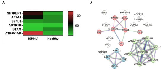 Among the DEGs, 31 genes are associated with endocytosis, all of which are part of clathrin-mediated endocytosis. Among them, 14 genes are specifically involved in cargo recognition. The expression of the key DEGs is presented in the heatmap (Figure 6A). The hub genes in the PPI network (Figure 6B, Tables S10 and S11) were identified as AP2A1 and SH3KBP1. The network clustering identified three functional groups, The first group, the negative regulation of MET activity, includes the genes AP2A1, SH3KBP1, SYNJ1, and STAM. The second group, ROS and RNS production in phagocytes, comprises members of the ATP6V1 family, such as ATP6V1AB. Lastly, the third group, Arp2/3 complex-mediated actin nucleation, includes the gene AGTR1b. These clusters might have the potential roles of identified DEGs in ISKNV pathogenesis.