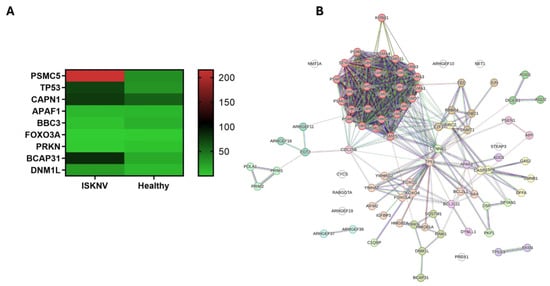 Programmed cell death (PCD) plays a critical role in maintaining cellular homeostasis and defending against pathogens, with viruses often exploiting PCD pathways to enhance their replication and lifecycle. In this study, a total of 106 DEGs were associated with programmed cell death in ISKNV-infected spleen, including 79 genes related to apoptosis and 4 genes to necroptotic cell death. Among these, PRKN was the only downregulated necroptosis-related gene. In our study, the 11 proapoptotic genes were differentially expressed, in which four DEGs, APAF1, BBC3, FOXO3A, and CAPN1 were downregulated in ISKNV-infected spleen. Interestingly, the BCL2L1 gene produces two distinct isoforms. The longer isoform, Bcl-xL, functions as an anti-apoptotic protein, while the shorter isoform, Bcl-xS, exhibits pro-apoptotic properties. In our study, we observed a downregulation of BCL2L1. It is essential to determine which isoform is predominant. The expression levels of the key genes in PCD pathway are presented in the heatmap (Figure 8A). The PPI network identified five distinct clusters: proteasome, p53 signaling pathway, ESC/E(Z) complex, apoptotic execution phase, and mitophagy (Figure 8B, Tables S14 and S15). Hub genes included TP53 in the p53 signaling pathway cluster and PSMC5 in the proteasome clusters. In the mitophagy cluster, DNM1L and BCAP31 were upregulated. Studies have shown that some viruses activate the mitophagy pathway to promote their own replication [8].
