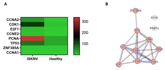 In our DEGs, 12 genes are involved in cell cycle arrest. The genes involved in G1 cell cycle arrest included CCN1, CCNA1, CCNA2, CCNE2, CDK1, E2F1, and E2F7, while PRMT1, CDK1, PCNA, and GADD45AB were involved in G2 cell cycle arrest. The genes TP53 and ZNF385A were involved in both G1 and G2 cell cycle arrest. In addition, TP53 and E2F1 were also involved in cell apoptosis. The expression level of the cell cycle arrest genes is presented in the heatmap (Figure 9A). PPI analysis identified the hub genes CCNE2, E2F1, CCNA2, TP53, CCNA1, PCNA, and CDK1. All are associated with the transcription regulation of cell cycle genes (Figure 9B, Tables S16 and S17).