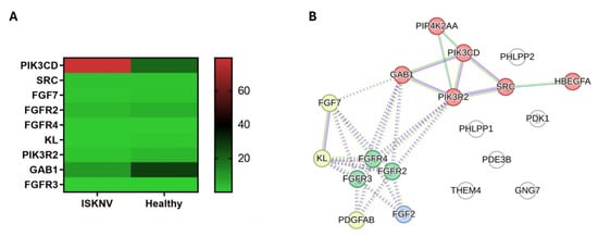 The phosphatidylinositide 3-kinase (PI3K) signaling pathway is integral to various cellular processes, including growth, proliferation, metabolism, and migration. During virus infections, this pathway can influence viral entry, replication, and immune evasion. Among the DEGs, 23 genes were found to be associated with the PI3K signaling pathway. The expression levels of the key genes involved in this pathway are illustrated in the heatmap (Figure 10A). The PPI analysis identified FGF7, FGFR2, FGFR3, FGFR4, GAB1, KL, PIK3CD, PIK3R2, and SRC as hub genes. Of these, GAB1, PIK3CD, PIK3R2, and SRC were grouped within the ErbB signaling pathway group, while FGFR2, FGFR3, and FGFR4 were categorized under the regulation of hematopoietic stem cell differentiation (Figure 10B, Tables S18 and S19).