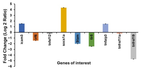 The differential expression analysis was performed based on the fold change (FC) of normalized read counts between the infected and control groups. Transcripts with an absolute FC greater than 2 and a false discovery rate (FDR) ≤ 0.05 were considered significantly differentially expressed. The DEG lists were functionally annotated using the DAVID bioinformatics tool, which inherently maps gene identifiers to associated protein products when performing enrichment analysis based on databases. DAVID’s internal algorithms and statistical tests were used to define the significance of the functional annotation. The identified DEGs were further classified into biological pathways using the manually curated Reactome server (https://reactome.org/ (accessed on 14 December 2024) [6]. For gene segregation in REACTOME, a homology analysis between Asian seabass and Zebrafish was first performed in ENSEMBL and orthoDB (Table S2a). The gene symbol list (Table S2b) of all genes homologous to those of zebrafish was input into the REACTOME server for pathway analysis. The genes were separately projected to all the species and human (all non-human identifiers are converted to their human equivalents). Based on the results from zebrafish and human species, the genes were grouped into pathways related to the innate immune response, adaptive immune response, antigen processing and presentation, cytokine-mediated immune response, IFN signaling, TLR signaling, cell death, cell communication, cell cycle arrest, endocytosis, and the PI3K pathway.