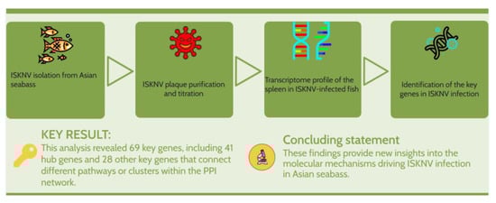 Schematic diagram summarizing the study workflow. This diagram outlines the key experimental steps, including ISKNV isolation from infected Asian seabass, viral plaque purification and titration, followed by transcriptome profiling of spleen tissue from experimentally infected Asian seabass. The study emphasizes the identification of key genes associated with ISKNV infection, providing insights into the molecular mechanisms of infection in Asian seabass.