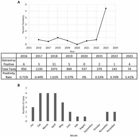 The detection of astrovirus in our patient population between 2016 and 2023. Positivity rate of astrovirus determined by using the total number of stool specimens tested on a multiplex, gastrointestinal PCR per year (A). Seasonality of astrovirus demonstrated by positivity per month (B). Data represent aggregated sum of total positives from each respective month. Data were collected from 1 January 2021 to 30 March 2023.