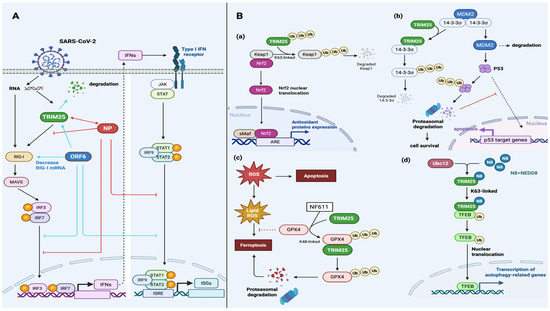 Biological functions of TRIM25 in SARS-CoV-2 infection and cancer cell survival. (A) SARS-CoV-2 proteins participate in viral immune evasion by interfering with antiviral signaling. SARS-CoV-2 viral RNA can activate TRIM25 and RIG-I for the subsequent aggregation of MAVS, which regulate IRF3/7 and IFN production. The IFNs produced bind to a type I IFN receptor to activate the JAK/STAT signaling pathway, leading to the production of ISGs. Both the SARS-CoV-2 nucleocapsid protein (NP) and ORF6 proteins influence the nuclear translocation of IRF3/7 and STAT. The NP recruits G3BP2 and TRIM25, while ORF6 mediates TRIM25 degradation, limiting TRIM25-mediated RIG-I ubiquitination. (B) TRIM25-mediated ubiquitination regulates multiple biological pathways. (Ba) TRIM25 can lead to the degradation of Keap1, resulting in the nuclear translocation of Nrf2 and the production of antioxidant proteins. (Bb) 14-3-3σ can be degraded by TRIM25-mediated ubiquitination, which contributes to the degradation of Mdm2 and p53. (Bc) The inhibitory effect of GPX4 on ferroptosis is negated by the participation of TRIM25 in the treatment of N6F11. (Bd) Neddylated TRIM25 can induce the nuclear translocation of TEFB, which is responsible for the transcription of autophagy-related genes. (This figure was created using BioRender. Liu, Q.X. https://BioRender.com/zi5oxce, accessed on 7 May 2025).