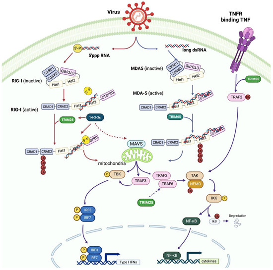 - Li, Y.; Wu, S.; Tian, X.; Kong, C.; Hong, W.; Xiao, T.; Wang, S.; Wei, Z.; Su, Z.; Ren, H.; et al. The structural basis of TRIM25-mediated regulation of RIG-I. J. Biol. Chem. 2025, 301, 108367. [Google Scholar] [CrossRef]