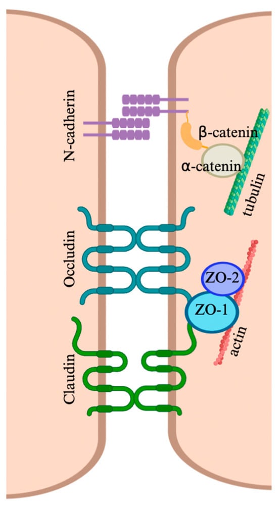 Organization of key tight junction proteins found at the blood–testis barrier. Claudins, occludin, and N-cadherin contain extracellular domains that interact with neighboring cells. Intracellularly, these integral membrane proteins interact with scaffolding proteins that are expressed entirely intracellularly (ZO-1, ZO-2, α-catenin, and β-catenin). Scaffolding proteins are responsible for linking the embedded integral membrane tight junction proteins to the cellular cytoskeleton. ZO-1: zonula occludens-1; ZO-2: zonula occludens-2. Figure made with Biorender.