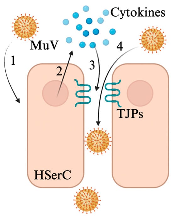 Despite the lack of clinical samples, in vitro and in vivo data illustrate potential mechanisms surrounding MuV entry into Sertoli cells and the subsequent dysregulation of the BTB (Figure 3). Sialic acid has been shown to mediate MuV entry into Sertoli cells via binding to receptor tyrosine kinases AXL and MER, further serving as potential binding sites for MuV on Sertoli cells [30]. The Sertoli cell response to MuV infection includes the expression of several pro-inflammatory cytokines that may contribute to BTB disruption during infection, such as TNF-α, IL-6, and CXCL10 [29,30,31]. Exposure of the BTB to TNF-α is classically associated with decreased BTB permeability, and MuV infection follows this pattern. The immunostaining of occludin and ZO-1 in healthy and MuV-infected mice demonstrates a clear disruption of two key tight junction proteins of the BTB during active viral infection [29]. Taken together, these data suggest that MuV impairs BTB permeability mainly through an immune-mediated pathway, with pro-inflammatory cytokines serving as the main effectors.