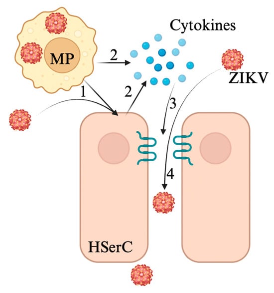 ZIKV testicular infection is well studied, with numerous studies demonstrating ZIKV infection of Sertoli cells binding to the AXL receptor and invasion of testicular lumen in murine models [109,113,114,115]. Mechanistically, ZIKV infection in the testicular microenvironment has received less attention, but some studies offer insights into how ZIKV crosses the BTB (Figure 5) [28,115,116]. ZIKV envelope protein has been associated with the rearrangement of the actin cytoskeleton of Sertoli cells, affecting BTB integrity in the context of ZIKV infection [34]. An analysis of Sertoli cell physiology during ZIKV infection showed the dysregulation of ZO-1 as well as exposure to isolated envelope protein, suggesting direct modulation by the ZIKV envelope protein [34]. Further evidence suggests that ZIKV infection of Sertoli cells is a critical step due to the subsequent induction of TNF-α, which thereby induces a weakening of BTB permeability [33]. Furthermore, ZIKV-infected S100A4+ macrophages, a myeloid macrophage subpopulation highly susceptible to ZIKV, have been strongly implicated in this process, as the secretion of IFN-γ was correlated with the translocation of the tight junction protein claudin-1 in the context of ZIKV infection of a mouse model [28]. ZIKV may therefore demonstrate both virus- and immune-mediated pathways toward the penetration of the BTB during testicular infection.