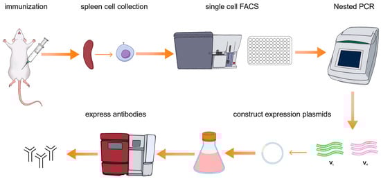 Workflow summary of mAb discovery pipeline in mice. Mice were immunized via intraperitoneal injection following a standardized protocol. Spleens were harvested post-immunization and processed into single-cell suspensions. After staining the cell suspension, NiV-positive specific memory B cells were sorted into 96-well plates by flow cytometry and lysed, and then the RNA encoding the monoclonal antibody was reverse transcribed, PCR amplified, and cloned into the expression plasmid, and the antibody was expressed using the Expi293 transient transfection system, and the antibody was purified using a Protein A column to obtain an NiV monoclonal antibody.