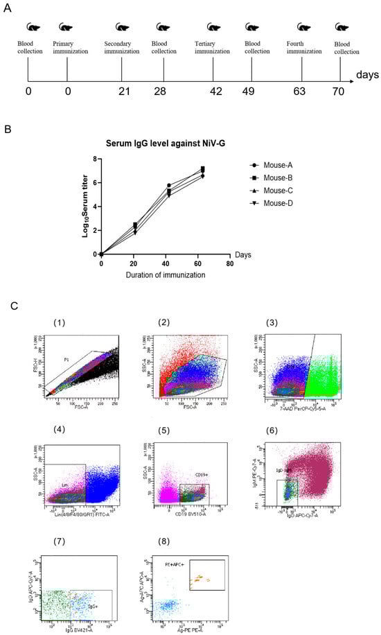 Six-week-old male BABL/c mice were acquired from Beijing Speufort Biotechnology Co., Ltd (Beijing, China). for this study, with all immunizations administered via intraperitoneal injection using a standardized protocol. The initial immunization (Day 0) consisted of 150 μL NiV-G protein (50 μg/dose, Sino Biological, Beijing, China) emulsified with Freund’s complete adjuvant (Sigma-Aldrich, St. Louis, MO, USA), followed by three subsequent immunizations at 21-day intervals using identical antigen quantities combined with Freund’s incomplete adjuvant (Sigma-Aldrich, St. Louis, MO, USA). Tail vein blood samples (150 μL) were collected seven days after the third immunization and again following the fourth dose, with all spleen collections performed two days after the final immunization. Animals were humanely euthanized at this timepoint, and spleens were processed within 24 h of collection to maintain cellular viability: splenocytes were isolated through mechanical disruption using a 40 μm cell sieve (Biologix, Jinan, China) pre-coated with HBSS containing 20% fetal bovine serum, followed by centrifugation (1500× g, 5 min) and resuspension in flow cytometry buffer (calcium/magnesium-free HBSS supplemented with 1% FBS, 1 mM EDTA, and 25 mM HEPES).
