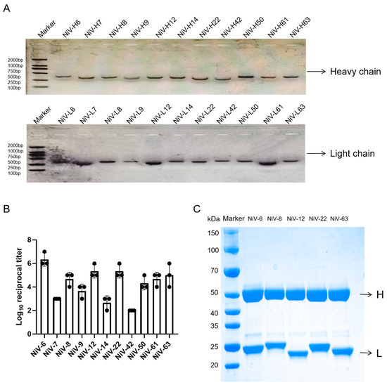 Expression and Identification of Monoclonal Antibodies. (A) Single-cell PCR amplification antibody variable region gene. Marker: DNA molecular standard quality Heavy chain: antibody heavy chain; Light chain: antibody light chain. (B) Indirect ELISA method to determine antibody-antigen binding affinity; data are the average value of three mouse serum titers. (C) SDS-PAGE electrophoresis of purified antibody. Marker: DNA molecular standard quality H: antibody heavy chain L: antibody light chain.
