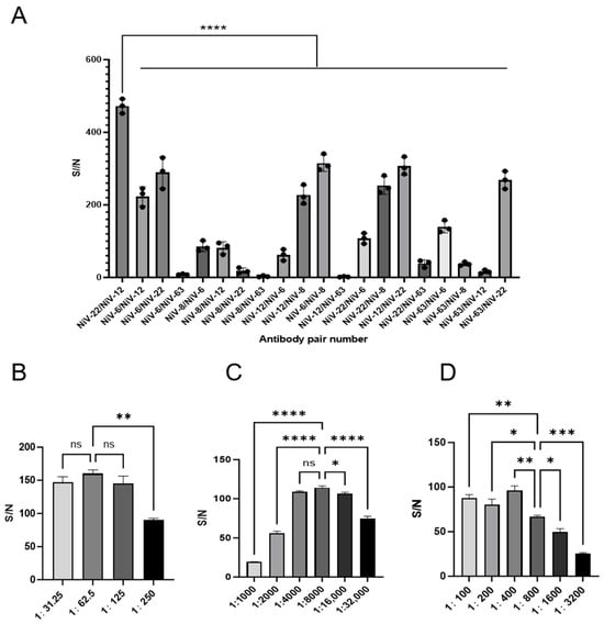 Optimization of AlphaLISA system. ns: no significance, *: p < 0.05, **: p < 0.01, ***: p < 0.001, ****: p < 0.0001. (A) Screening of the best antibody pairs for the AlphaLISA detection system. (B) Optimization of the dilution ratio of donor microspheres. (C) Optimization of dilution ratio of biotinylated NiV antibody. (D) Optimization of dilution ratio of NiV antibody-conjugated receptor microspheres.