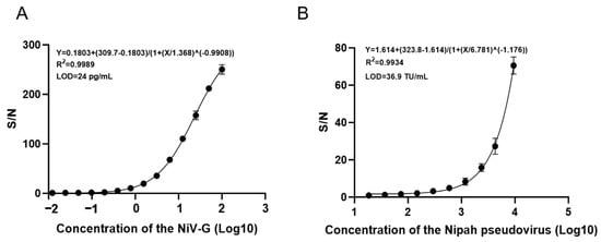 Using the AlphaLISA signal-to-noise ratio (S/N) as a function of NiV-G, a standard curve was calculated. The results indicate that the S/N ratio increases with the increase in antigen concentration, with the four-parameter fitting equation being Y = 0.1803 + (309.7 − 0.1803)/(1 + (X/1.368)^(−0.9908)), and the correlation coefficient R2 = 0.9989, with a limit of detection (LOD) of 24 pg/mL. (Figure 5A) Similarly, a standard curve was calculated using the Nipah pseudovirus, and the results showed that the S/N ratio increases with the increase in antigen concentration, with the four-parameter fitting equation being Y = 1.614 + (323.8 − 1.614)/(1 + (X/6.781)^(−1.176)), and the correlation coefficient R2 = 0.9934, with the LOD of the pseudovirus being 36.9 TU/mL (Figure 5B).