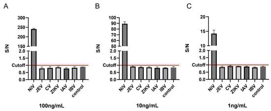 Specificity evaluation of AlphaLISA. (A) The S/N values of different viral antigens at 100 ng/mL; (B) The S/N values of different viral antigens at 10 ng/mL; (C) The S/N values of different viral antigens at 1 ng/mL. NiV: Nipah virus, IAV: Influenza A virus, IBV: Influenza B virus, JEV: Japanese encephalitis virus, CV: Coxsackievirus, ZIKV: Zika virus.