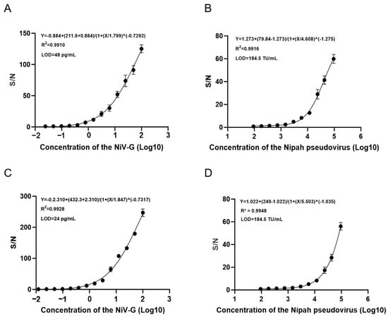 To assess the interference resistance of the detection system, NiV-G protein and NiV pseudovirus were respectively mixed with 10% human serum and pig serum to simulate real samples, establishing a quantitative standard curve based on the AlphaLISA signal-to-noise ratio (S/N). The results showed that the limit of detection (LOD) of NiV-G protein in pig serum was 48 pg/mL, with the four-parameter logistic (4PL) regression model fitting equation as: Y = −0.884 + (211.6 + 0.884)/[1 + (X/1.799)^(−0.7292)] (R2 = 0.9910, Figure 7A); while the detection sensitivity of NiV pseudovirus in pig serum reached 185 TU/mL, with its 4PL model equation as: Y = 1.273 + (79.84 − 1.273)/[1 + (X/4.608)^(−1.275)] (R2 = 0.9916, Figure 7B). In the human serum system, the LOD of NiV-G protein was further reduced to 24 pg/mL, with with its 4PL model equation as: Y = −0.2.310 + (432.3 + 2.310)/(1 + (X/1.847)^(−0.7317) (R2 = 0.9928, Figure 7C); the detection sensitivity of NiV pseudovirus also reached 185 TU/mL, with its 4PL model equation as: Y = 1.022 + (249 − 1.022)/(1 + (X/5.503)^(−1.035) (R2 = 0.9948, Figure 7D). The above data indicate that this detection method possesses high sensitivity and strong robustness (R2 > 0.99) across cross-species serum matrices, making it suitable for precise quantitative analysis of NiV pathogens in complex biological samples.