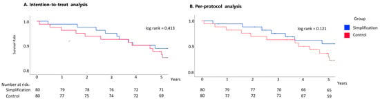 In the ITT analysis, the five-year survival rate was 88.8% in the simplification group vs. 87.5% in the control group (log-rank = 0.413). Regarding PP analysis, the five-year survival rate in the simplification group was 90.7%, and 86.9% in the control group (log-rank = 0.121). Kaplan–Meier tables are presented in Figure 1.