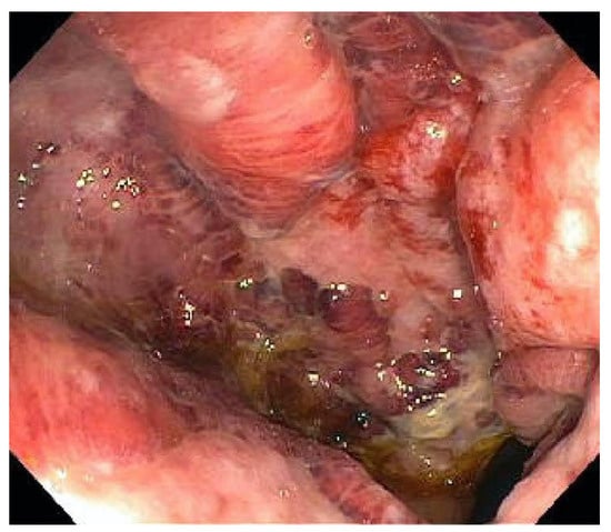 - Hirayama, Y.; Ando, T.; Hirooka, Y.; Watanabe, O.; Miyahara, R.; Nakamura, M.; Yamamura, T.; Goto, H. Characteristic endoscopic findings and risk factors for cytomegalovirus-associated colitis in patients with active ulcerative colitis. World J. Gastrointest. Endosc. 2016, 8, 301–309. [Google Scholar] [CrossRef] [PubMed] [PubMed Central]