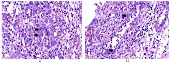 CMV-infected (a) mesenchymal cells from colonic tissue; (b) endothelial cells from colonic tissue. These CMV-infected cells have large ovoid nuclei with basophilic intranuclear inclusions (Cowdry bodies) surrounded by a clear halo (arrows) [37].