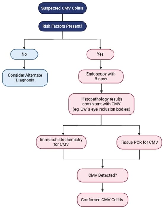 Noninvasive diagnostics, such as whole-blood PCR and pp65 antigenemia, are frequently used to assess systemic CMV viremia, especially in immunocompromised patients like transplant recipients, where they help guide pre-emptive antiviral therapy. However, their utility in predicting CMV colitis in IBD patients remains uncertain, as blood-based PCR detection does not always correlate with tissue-invasive disease in the colon. Studies have shown that while these tests are highly specific, they lack the sensitivity required to reliably detect colonic CMV reactivation in IBD patients [32,33]. Blood-based tests, including PCR, have a high positive predictive value (PPV), which can make a positive result useful in reducing the need for invasive endoscopic procedures. However, transient CMV viremia, which may not require treatment, complicates the interpretation of these tests. It remains unclear whether blood-based tests can accurately predict the viral burden in colonic mucosa, which is crucial for understanding disease severity and response to antiviral therapy [35]. Given these limitations, tissue biopsy remains the gold standard for diagnosing CMV colitis, particularly in patients with moderate-to-severe IBD, where early identification and treatment can significantly influence outcomes (Figure 3). Blood-based tests can serve as a valuable adjunct in determining when to withhold immunosuppressive therapy or in predicting the risk of colectomy, but they should not replace tissue-based diagnostics [34]. A summary of the investigations and of the diagnostic approach required for diagnosing CMV colitis is provided in Table 2 and Figure 4.
