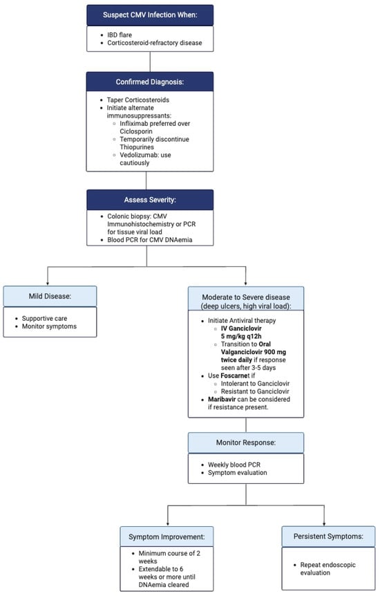 Upon diagnosing CMV colitis, the focus should shift to gradually tapering corticosteroids, and its use should be reconsidered only once CMV infection has been properly treated. There is limited direct evidence on the optimal timing for initiation of biological therapies in this setting. However, an alternative anti-inflammatory should be introduced to promote remission. Infliximab is generally preferred over ciclosporin when feasible, given the potential TNF-avidity of CMV [45]. In a case series involving 23 patients, Minami et al. reported association between ciclosporin treatment and increasing likelihood for CMV reactivation [46]. Conversely, monoclonal antibodies targeting TNF-alpha, such as infliximab and adalimumab, have not been found to increase the risk of CMV reactivation. Studies show that CMV tissue infection is not associated with clinical resistance to these therapies. The beneficial effects of anti-TNF-α therapies on CMV infection are likely due to the reduction in TNF-α pro-inflammatory actions, which can otherwise promote viral replication. As a result, these biotherapies are recommended for managing moderate to severe flare-ups of IBD, particularly in cases complicated by CMV colonic infection [10,16].