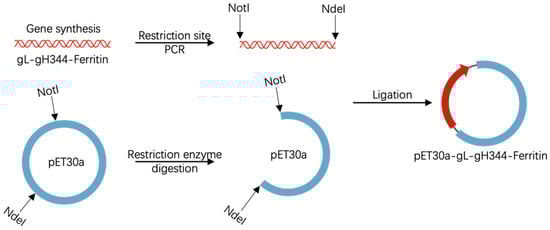 The gH344 subunit (a truncated variant of full-length gH lacking residues 345–679) was flanked by flexible glycine-serine linkers (GGGGS × 3) at both ends, thus connecting gL and the ferritin nanoparticle scaffold (helicobacter pylori). The recombinant plasmid pET30a-gL-gH344-Ferritin was custom-synthesized by GenScript Biotech Co., Ltd. (Nanjing, China). As shown in Figure 1, synthesized gL-gH344-Ferritin DNA fragments were PCR-amplified to introduce NotI and NdeI restriction sites at the termini, respectively. These fragments were subsequently ligated into the pET30a(+) vector (Novagen, Darmstadt, Germany), which had been pre-digested with NotI and NdeI (New England Biolabs, Ipswich, MA, USA) at 37 °C for 2 h. Ligation reactions were performed using T4 DNA ligase (Thermo Fisher Scientific, Waltham, MA USA) at 16 °C for 1 h. The ligated plasmids were then transformed into DH5α competent cells. All constructions were validated by bidirectional Sanger sequencing, confirming sequence identity to the reference design.
