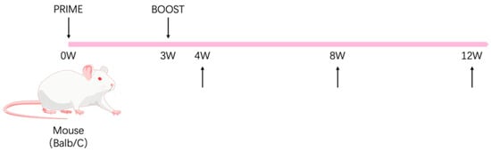 Specific pathogen-free (SPF) female BALB/c mice (aged 6–8 weeks) were purchased from Vital River Laboratories (Beijing, China) and randomly divided into three groups (n = 15/group). The mice were immunized intramuscularly at weeks 0 and 3. The experimental group received 15 μg/100 μL of gL-gH344-Ferritin mixed with 50% (v/v) Al hydrogel® adjuvant (2% suspension, France). The control group received 2 × 106 PFU/100 μL of MVA-gHgL, which was generated via homologous recombination to incorporate the full-length gHgL gene into the MVA genome. Negative controls were immunized with an equal volume of PBS. The mice were then sacrificed for immunogenicity evaluation at weeks 4, 8, and 12 after the prime vaccination, and five mice were selected from each group (Figure 2). Whole blood samples were collected using orbital hematocrit. The samples were then left at room temperature for 30 min, followed by centrifugation at 1500 rpm for 10 min. The upper layer of the serum samples was collected and stored at −20 °C for antibody detection. The mice were euthanized by cervical dislocation, and their spleens were meticulously removed and processed. Splenic lymphocytes were isolated using a mouse lymphocyte isolation solution (Dakewe, Shenzhen, China) according to the manufacturer’s instructions, and the total cell count was determined using an automated cell counter (Beckman, Brea, CA, USA).